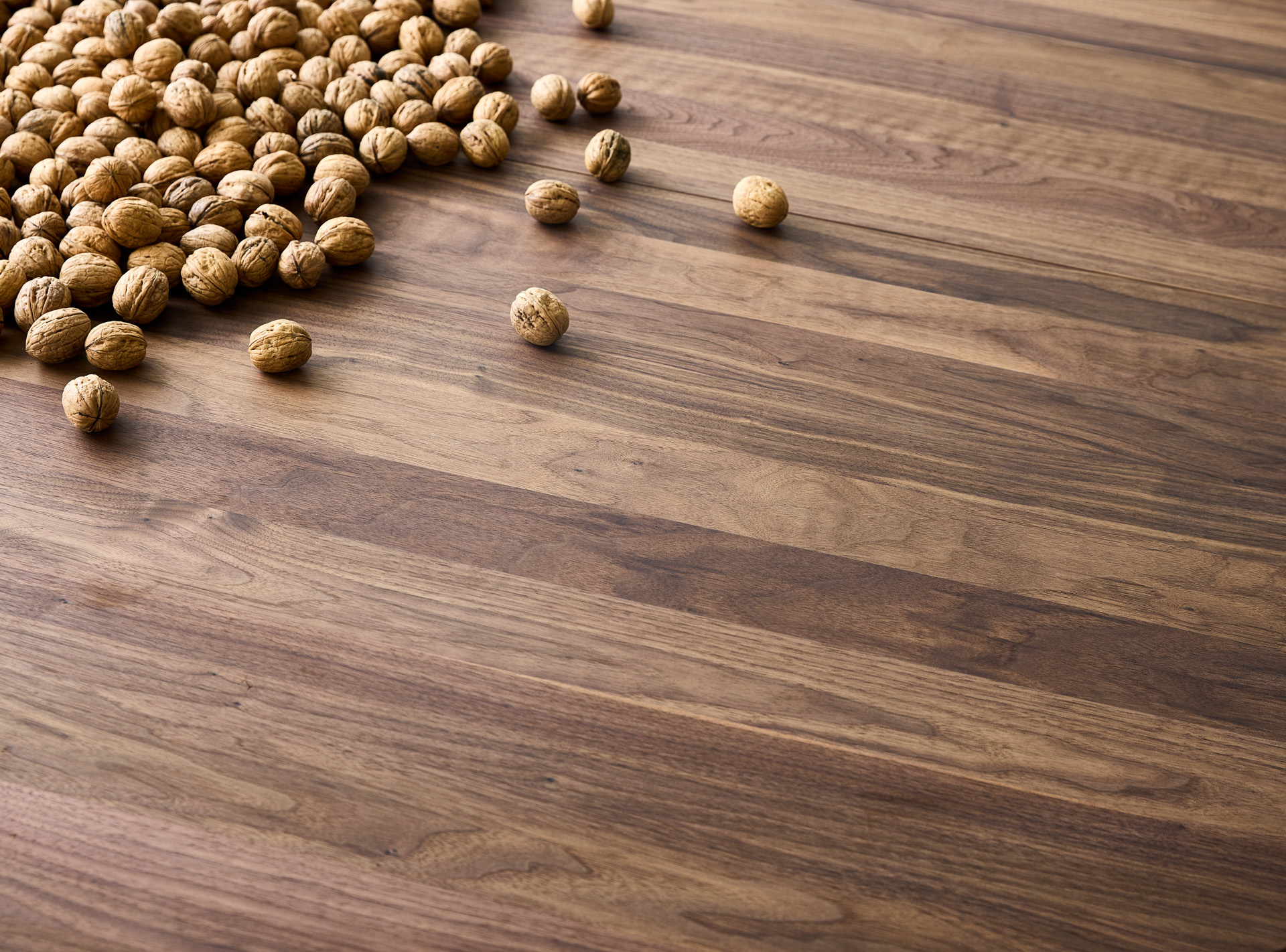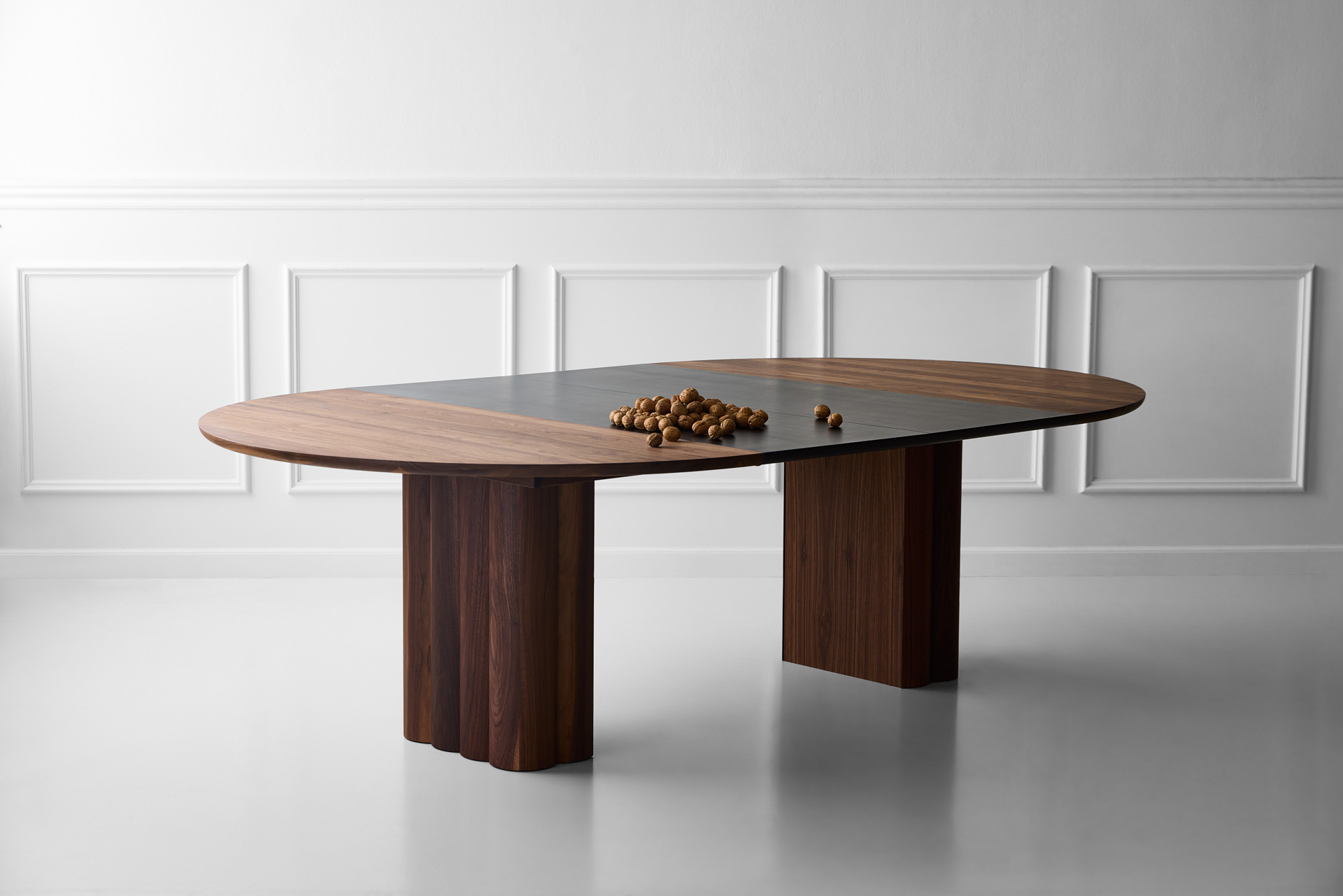 Solid wood (oak, smoked oak or walnut); extension leaves in wood or black MDF