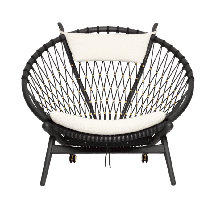 The Circle Chair by Hans J. Wegner is a bold-yet-airy sculptural icon built around a perfect laminated-wood circle, with a gently giving flag-line seat and optional upholstered cushions.