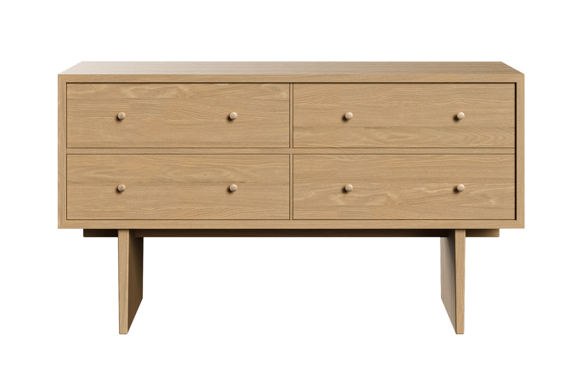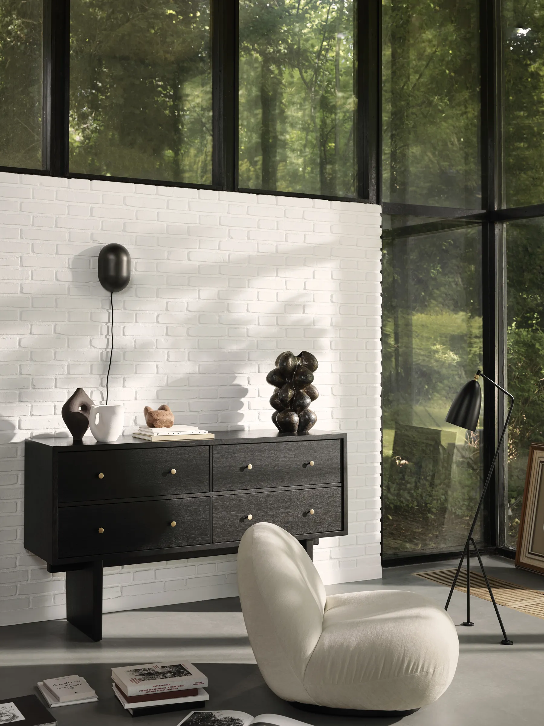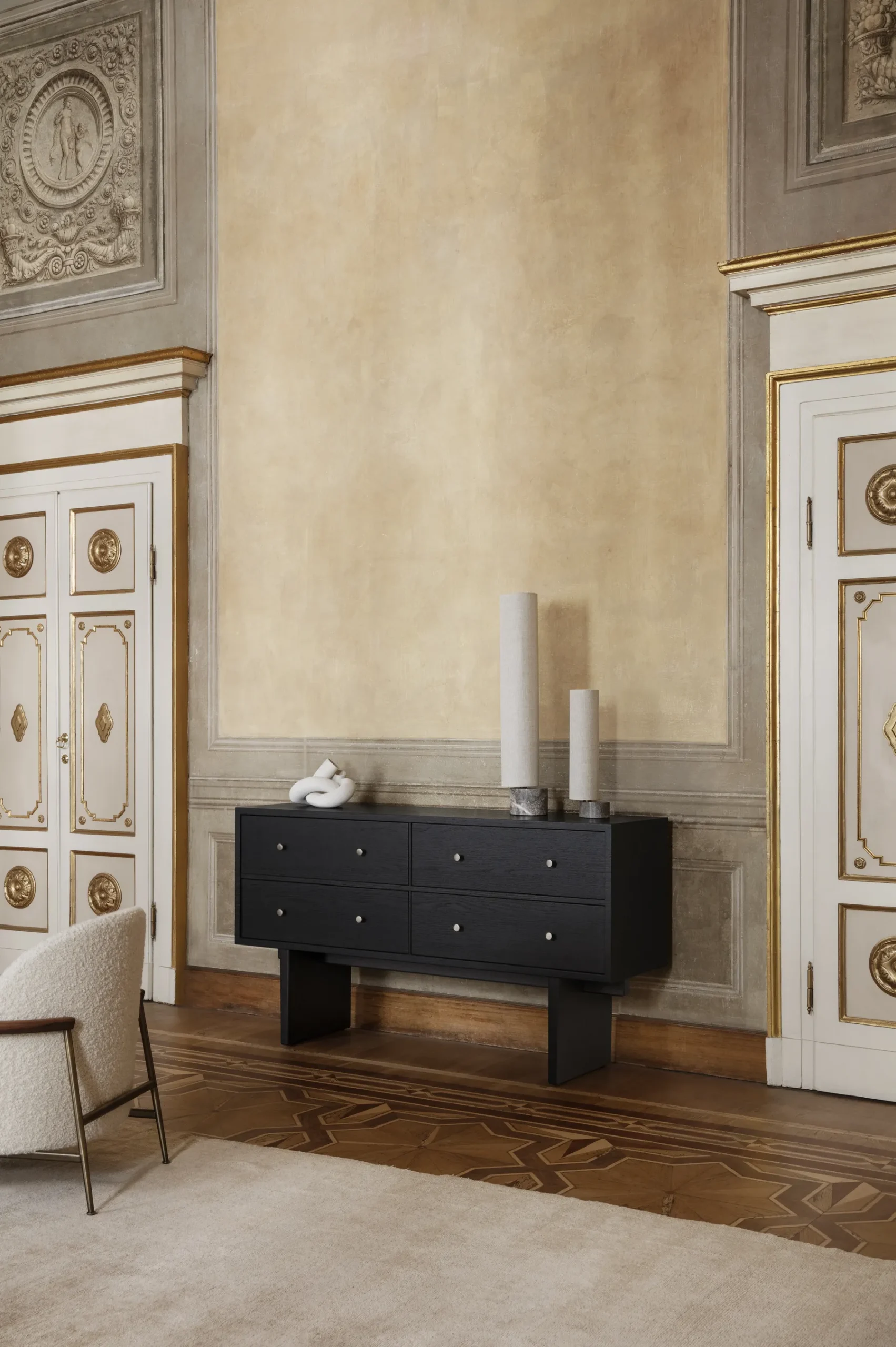 The Private Sideboard by Space Copenhagen is supported by a light yet strong leg structure, this oak-veneered piece features a symmetrical four-drawer layout and refined brass details, making it a versatile addition to any room in the home.
