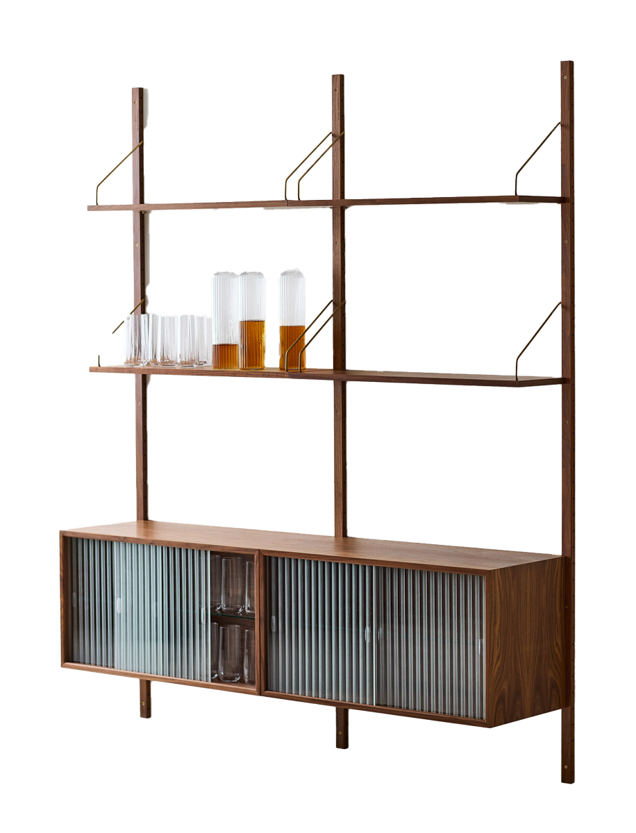 Crafted in solid wood with beautifully finished rails shelves and cabinets it brings warmth and natural texture to any interior. Choose from shelves with brass or stainless steel hangers sliding door cabinets in wood clear glass or rippled glass and even handwoven veneer fronts for a refined touch. The collection also includes writing desks drawers and LP storage that feel smooth sturdy and thoughtfully made.
