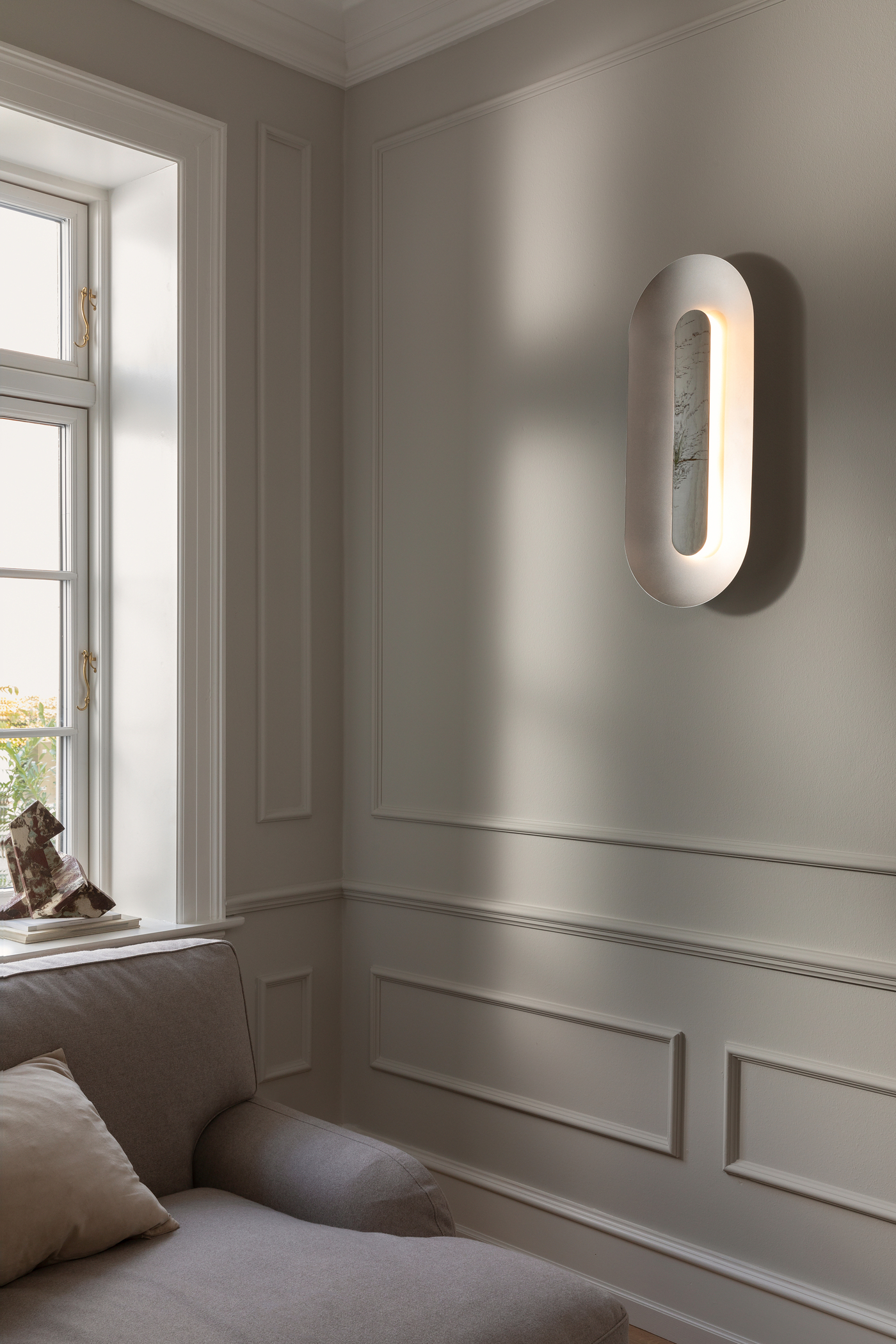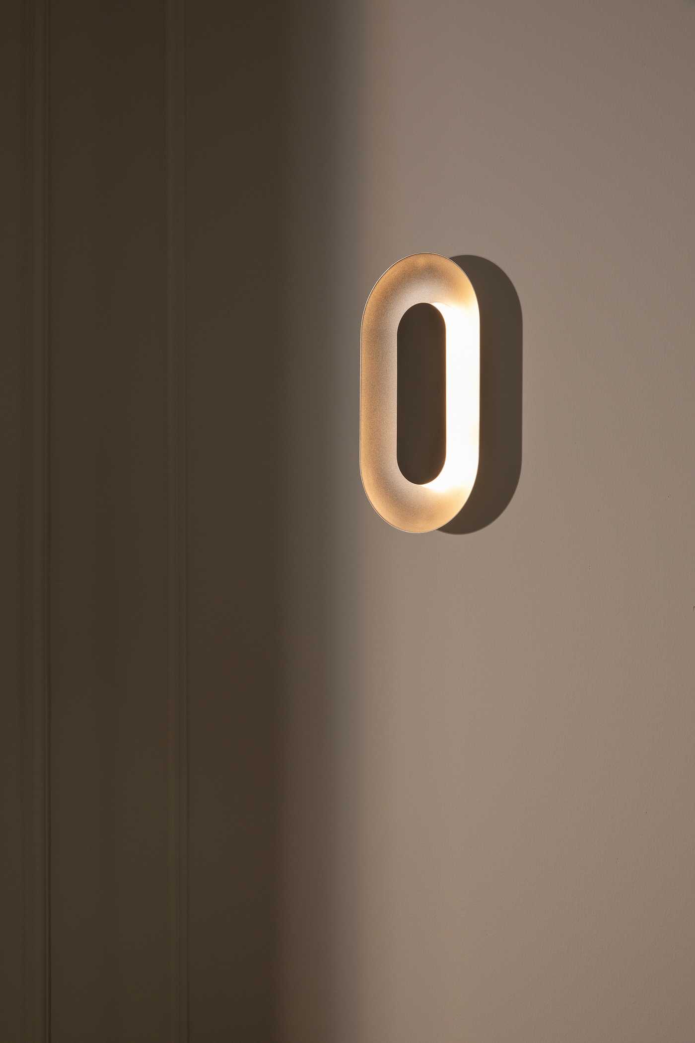 The Sasi Wall Lamp brings a sculptural elegance to your home with its soft expression and beautifully balanced materials. An oval aluminium frame in a smooth satin finish surrounds a polished mirrored shade that hides the integrated LED light source. When illuminated, the lamp creates a gentle reflective glow that dances across the frame adding a subtle atmospheric shimmer to the room.