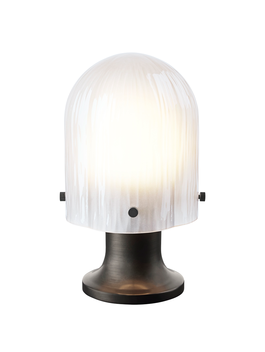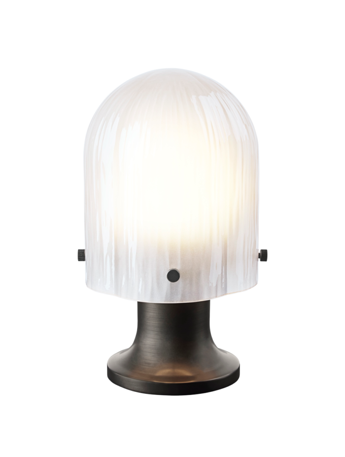 Inspired by the behavior of light on water, this elegant portable lamp features a finely patterned, sandblasted glass shade that mimics the appearance of water currents. The portable design makes it a modern, sophisticated lantern that casts a beautiful, diffused glow.