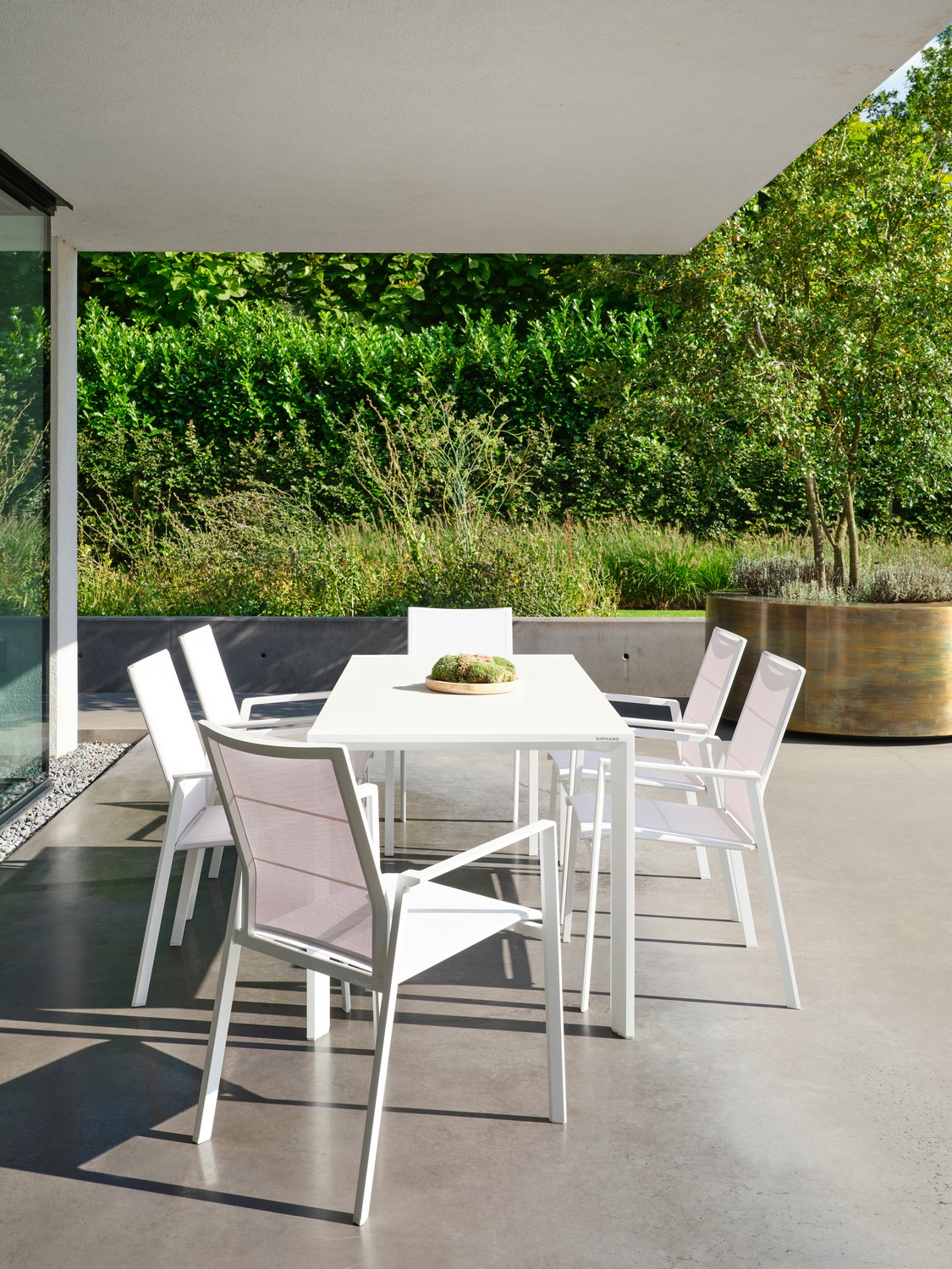 The Selecta Outdoor Dining Table is a low-maintenance, classic outdoor table in round or rectangular forms, with powder-coated aluminium legs