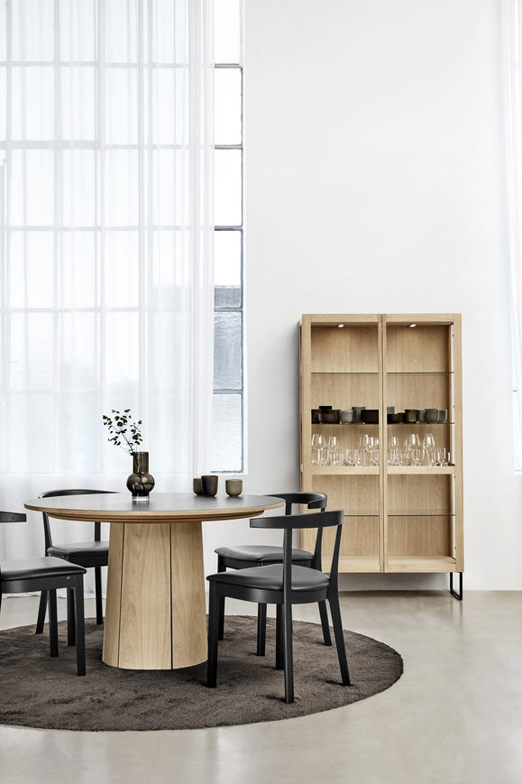 The Skovby 33 is a world-renowned, patented round dining table featuring an iconic synchronous extension system that expands from the center with a single, effortless movement.