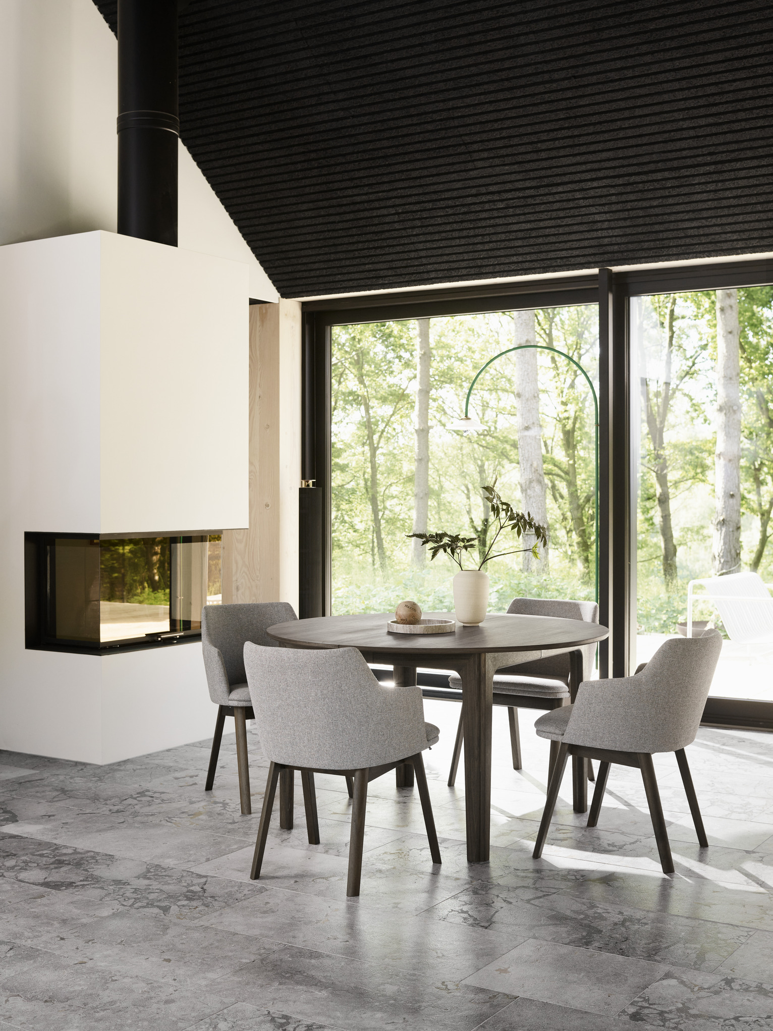 Fully upholstered, the 65 brings a warm tactile softness to your dining space while keeping a sleek contemporary profile. The construction is impressively robust, designed for everyday use and built to hold its shape and comfort over time.