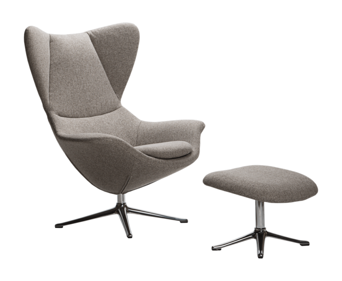 Materials: Wood frame (seat + back) and quality foam padding. Features pleasant armpads, good lumbar support, and a built-in neckrest. Options: Comes with a unique organic design swivel base available in finishes like polished aluminum or black powder coat. Available in a wide selection of upholstery.
