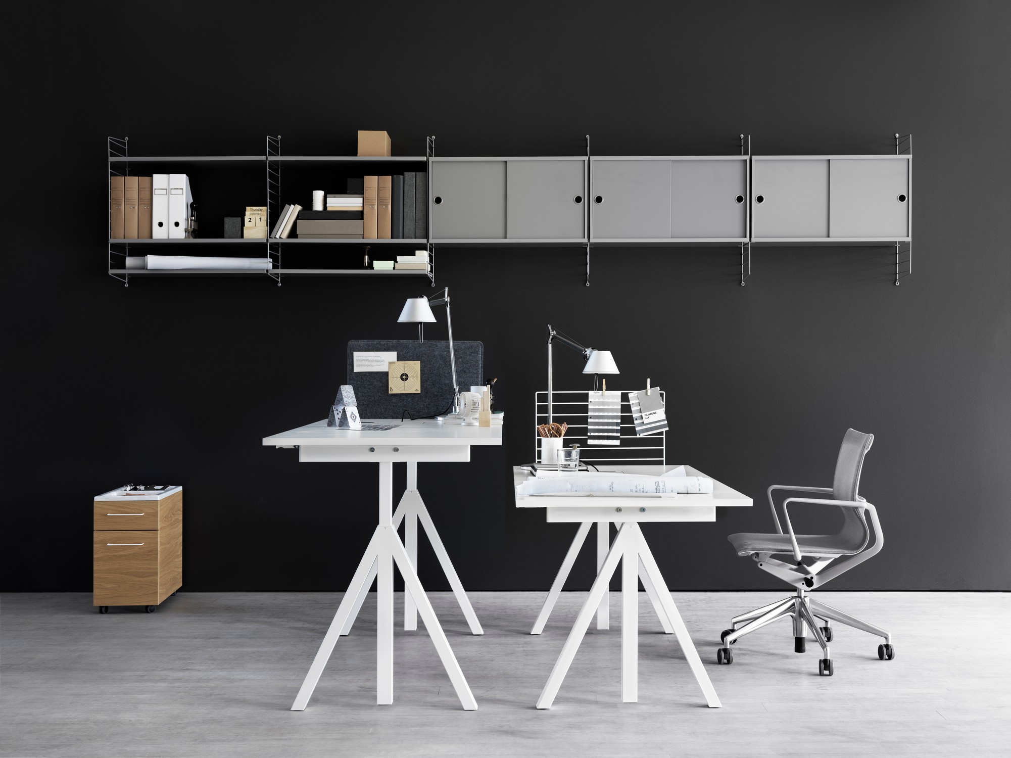 Available in multiple widths and surface finishes, including oak and ash veneered MDF or laminate tops, this desk retains the visual lightness and refined detail characteristic of String’s design philosophy. Integrated cable management and optional accessories like pull-out drawers and screens help maintain a tidy, productive workspace without visual clutter. The powder-coated steel frame and high-quality tabletop materials ensure durability and stability, while the flexibility of the configuration allows this desk to function as a dedicated home office solution or as part of a larger, collaborative workspace.