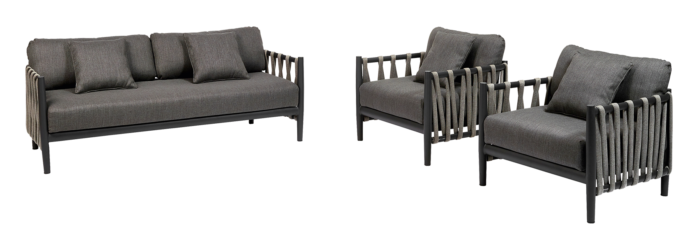 Switch Rope takes indoor coziness outside. Comfy cushions generously fill up a minimalistic aluminum framework that is playfully entwined by thick knitted outdoor ropes. This chair invites you to sink in deeply, blending modern architecture with rural comfort.