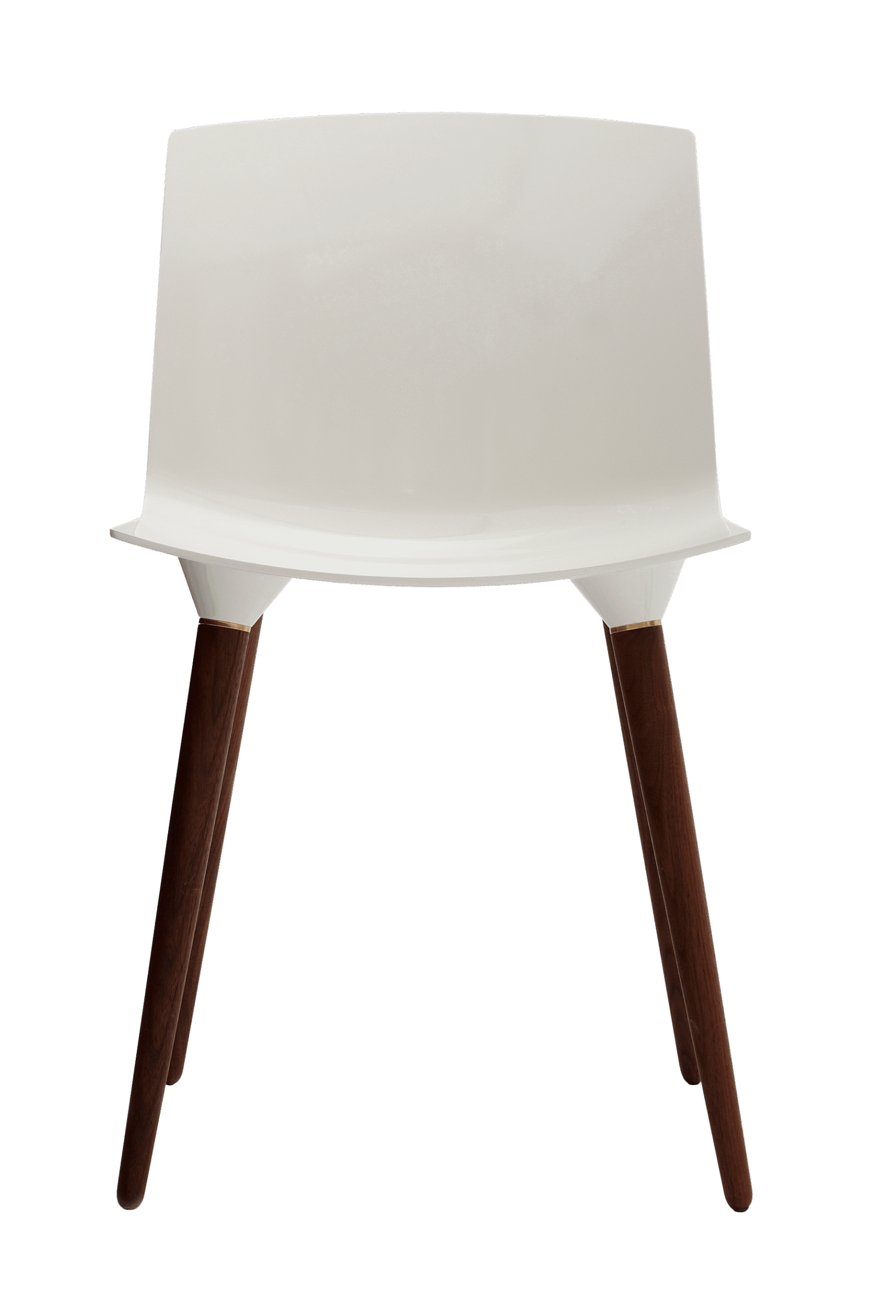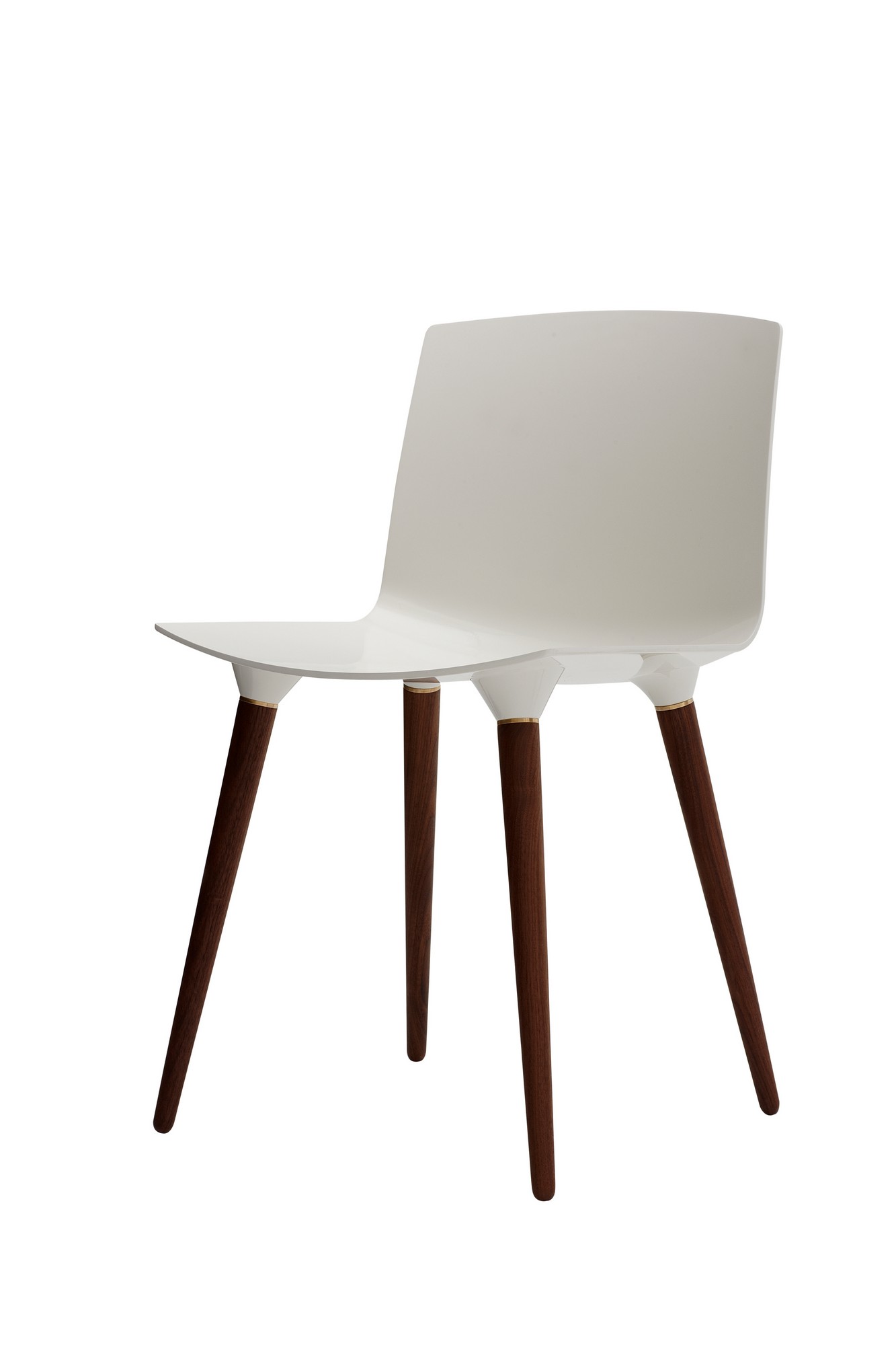 Matte plastic or fibre-reinforced composite seat + solid wood legs + brass ring detail.