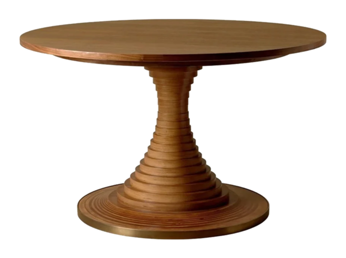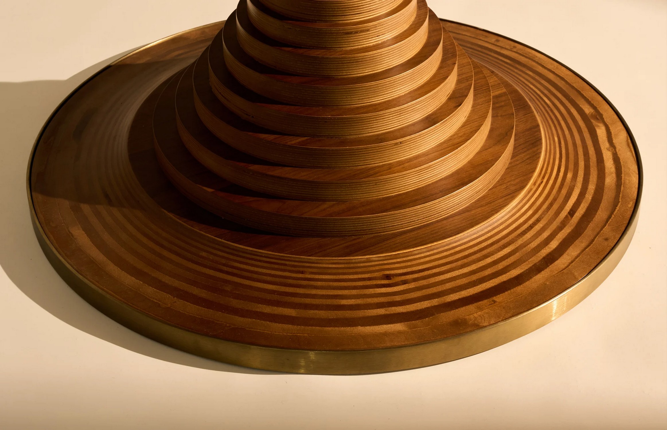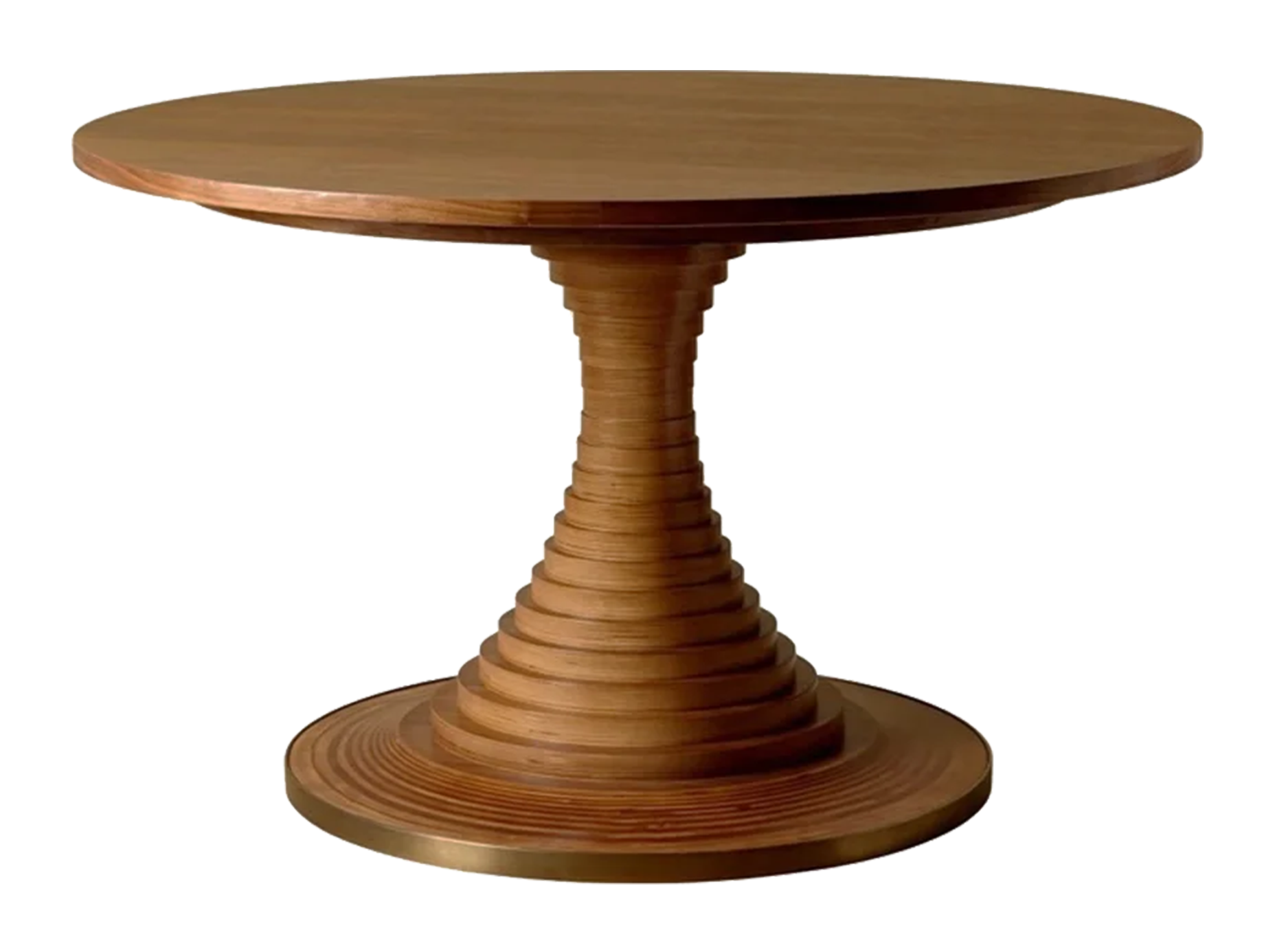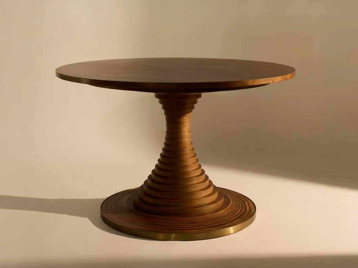 Designed in 1963 by renowned Italian architect Carlo De Carli, the Tavolo a Dischi Dining Table is a masterful expression of structural innovation and timeless elegance. The round base is formed from stacked 3 cm thick FSC® Mix-certified birch plywood discs of varying diameters, wrapped around a concealed metal core to create a sculptural, curved profile. A generous walnut veneer tabletop, available in two sizes, rests above, while a burnished brass-toned steel band at the base adds contrast and durability. Ideal for dining, meetings, or gatherings, Tavolo a Dischi is a true centerpiece designed to bring people together.