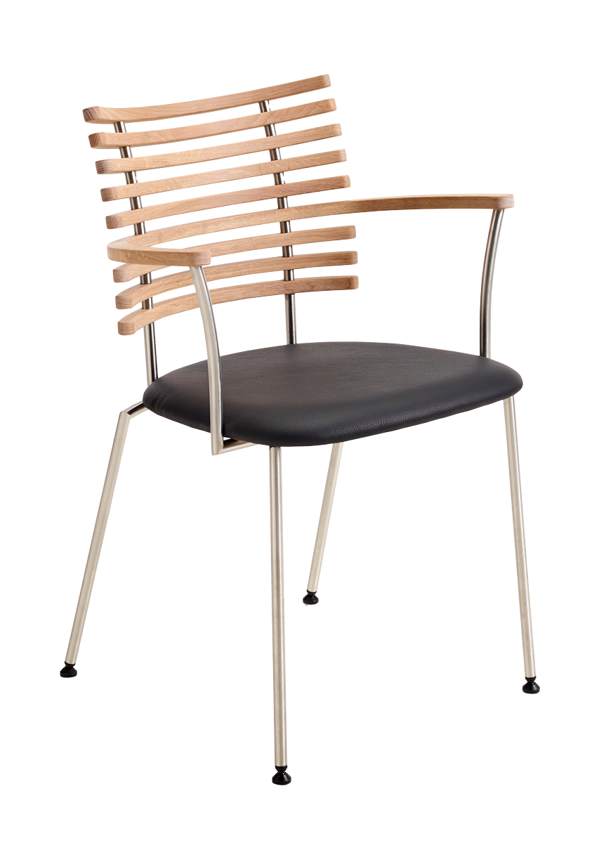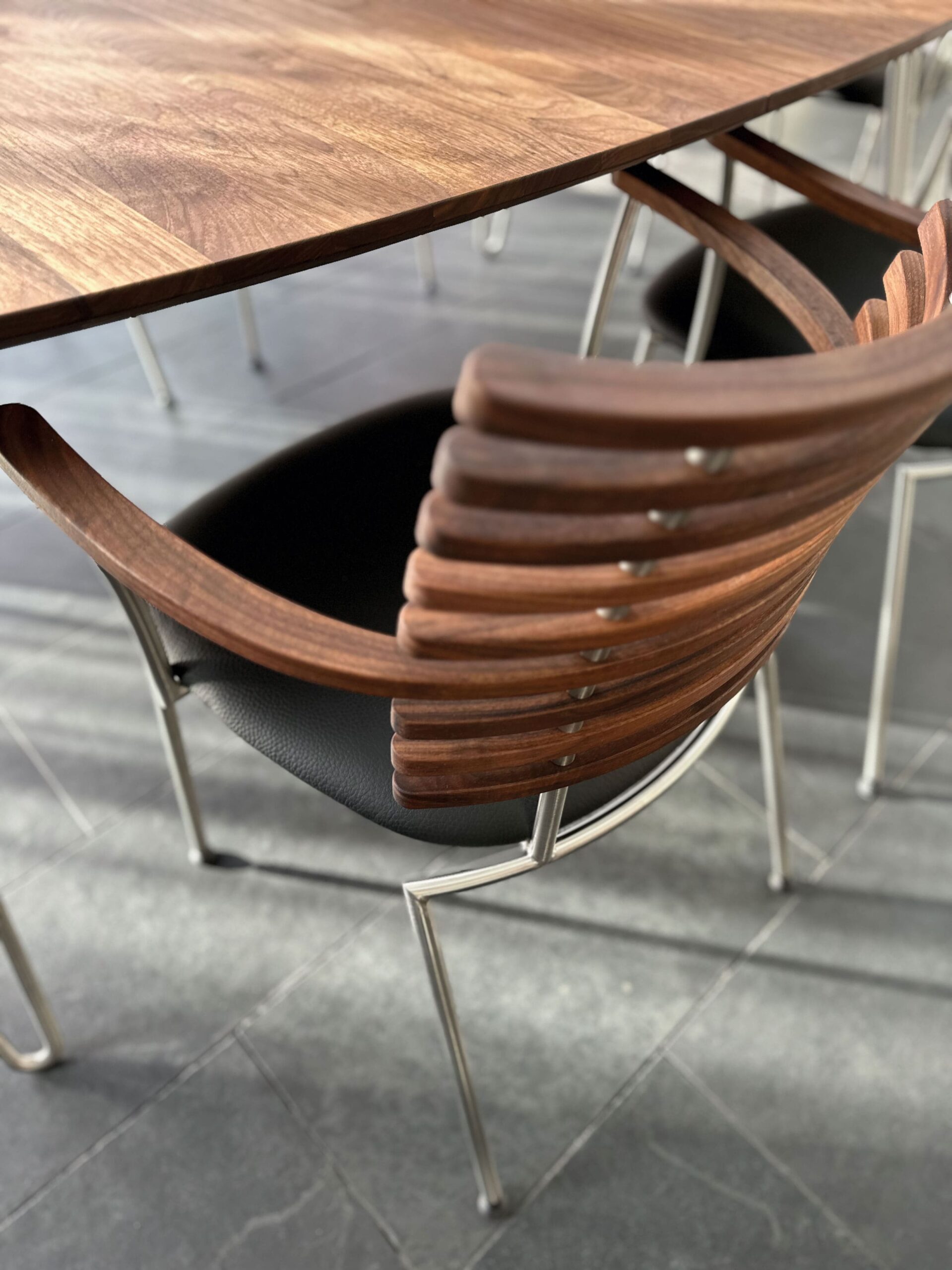 Wood Finishes: Natural finishes, Black-stained. Back Rails: New colors available (Hazelnut, Muted Moss, Gloomy Bordeaux). Seat: Upholstered in Leather or Fabric. Base: Stainless Steel or Black Powder Coated Steel.