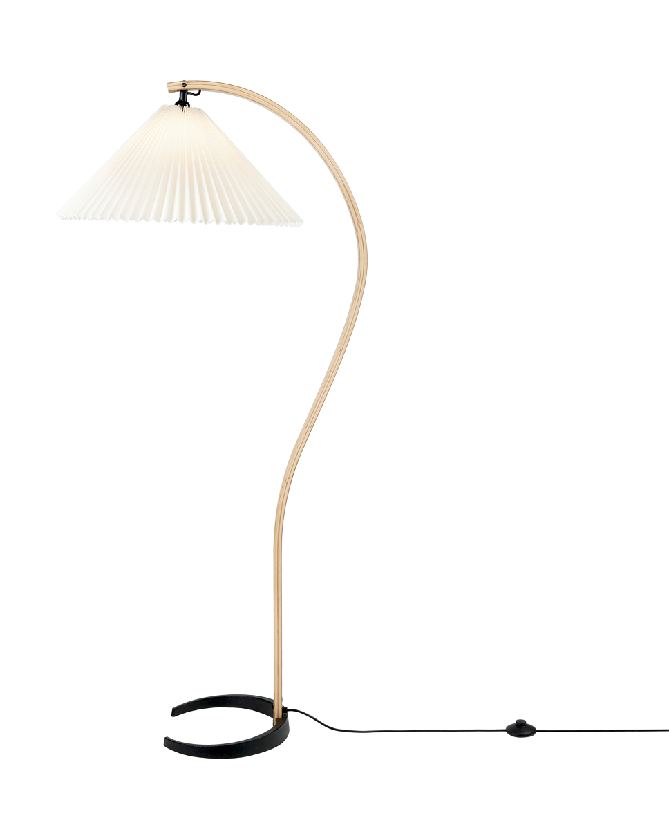 The floor lamp counterpart to the table version, utilizing the same distinctive curved wooden spine and pleated shade to create a compelling, natural silhouette and a cozy, inviting atmosphere.