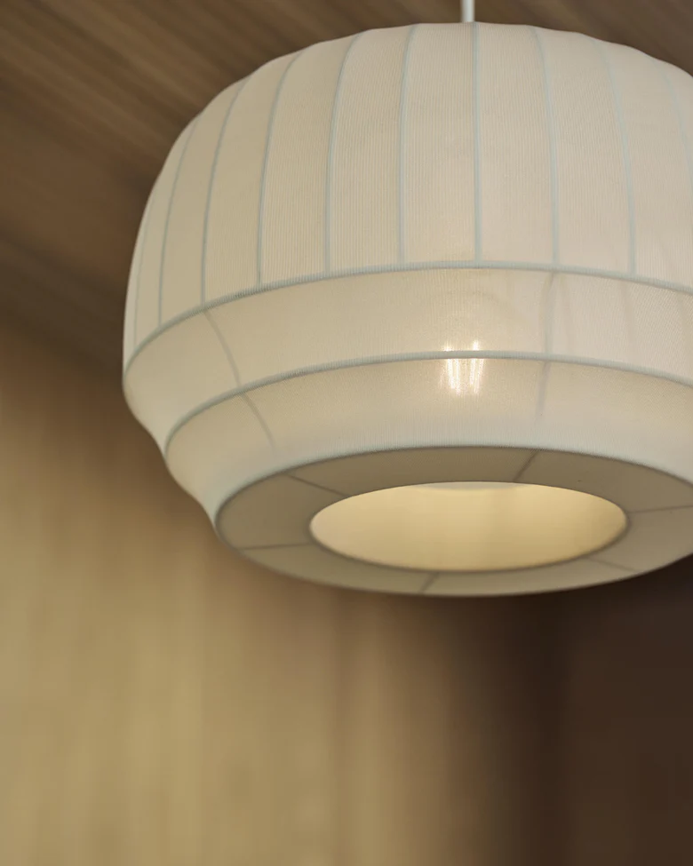 This pendant brings a cloud-like quality to the ceiling, diffusing light through a translucent knitted fabric. It provides a contemporary, more durable alternative to the classic paper lantern, suitable for hanging individually or in clusters at different heights.