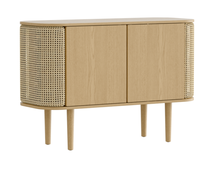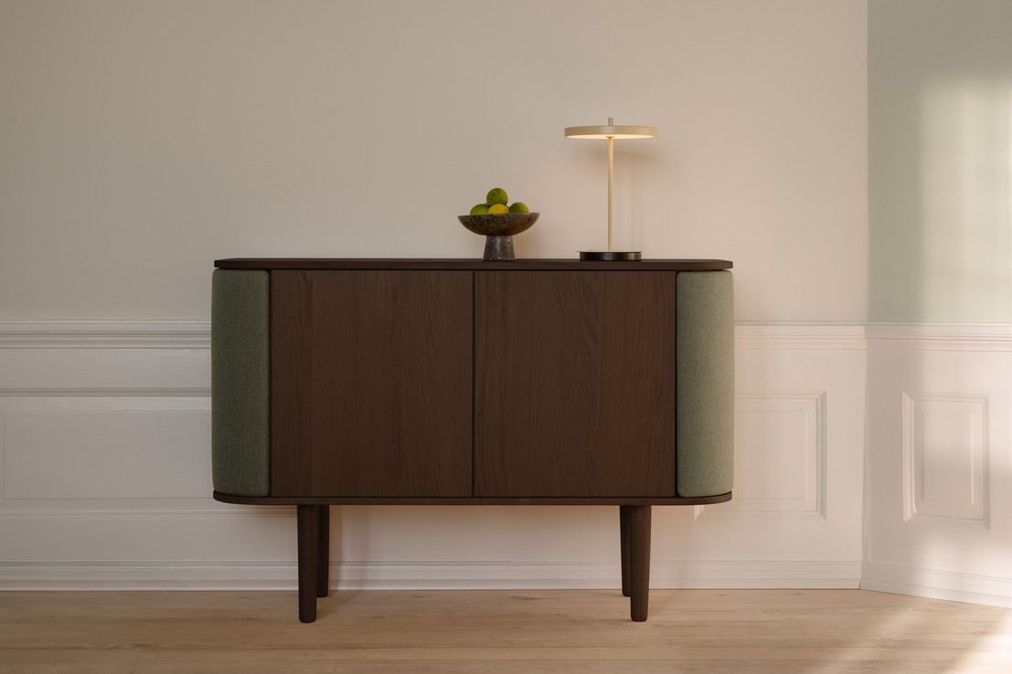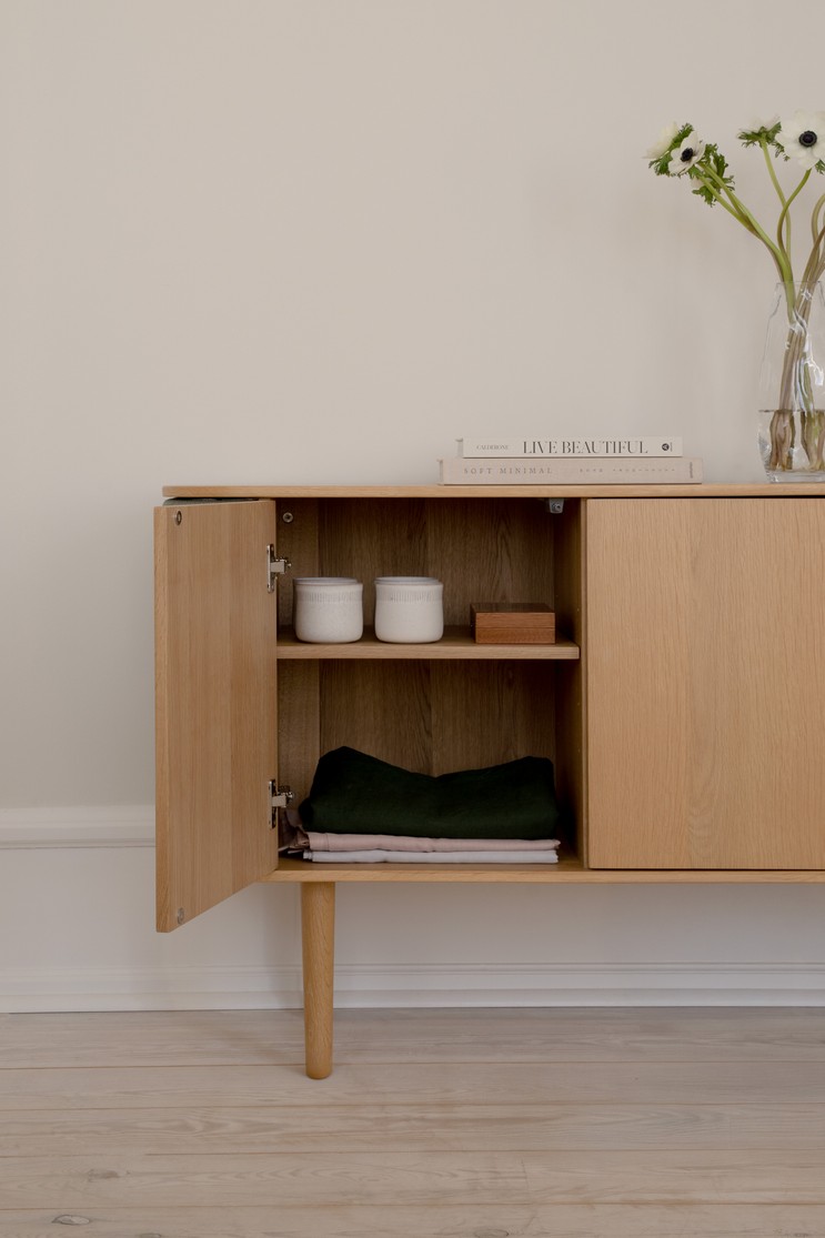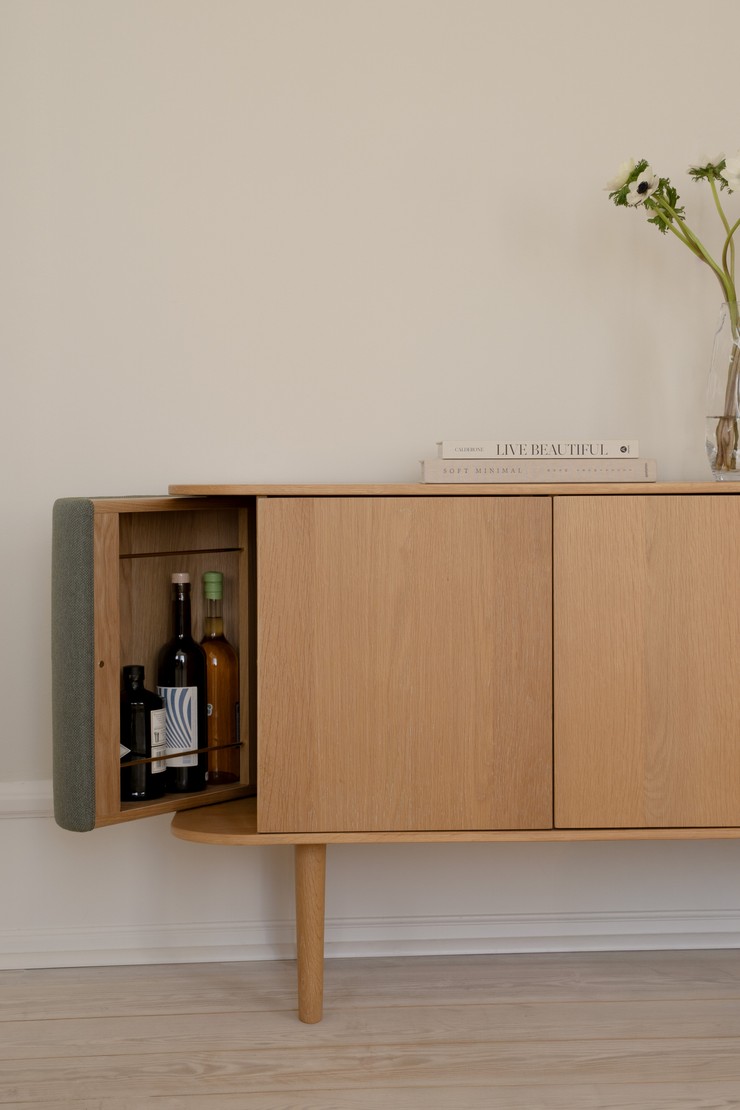 Treasures is a customizable cabinet that brings a tactile touch to storage. The side “wings” are ideal for storing books or liqueurs, while center compartments provide stable shelving for ceramics. Its Nordic expression is elevated by the ability to choose different wood finishes and door materials.