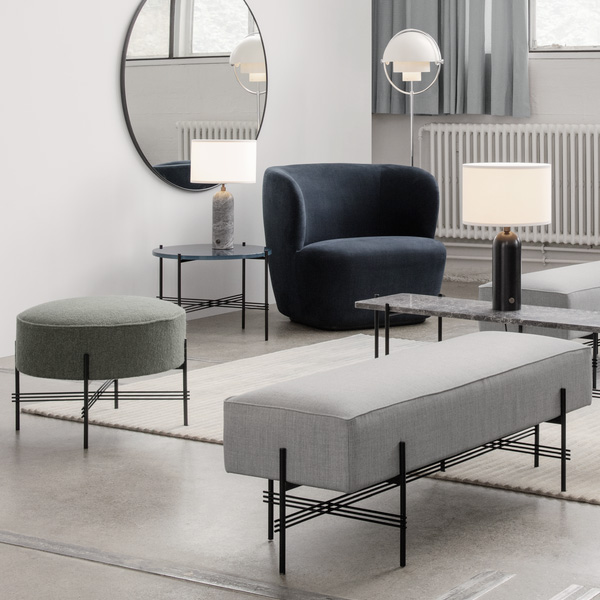 The TS Pouffe in rectangular is a versatile and elegant addition to modern living spaces, combining everyday functionality with refined comfort. Designed by GamFratesi, it echoes the distinctive aesthetics of the TS Collection, originally created for The Standard restaurant in Copenhagen. Slender metal legs and refined decorative detailing give the pouffe a light, architectural presence, while the organic upholstered form adds softness and comfort. Decorative piping, a signature element in GamFratesi’s designs, enhances the sculptural silhouette. Easy to move and perfectly proportioned, the TS Pouffe works effortlessly as an informal seat, footrest, or flexible accent piece within contemporary interiors.