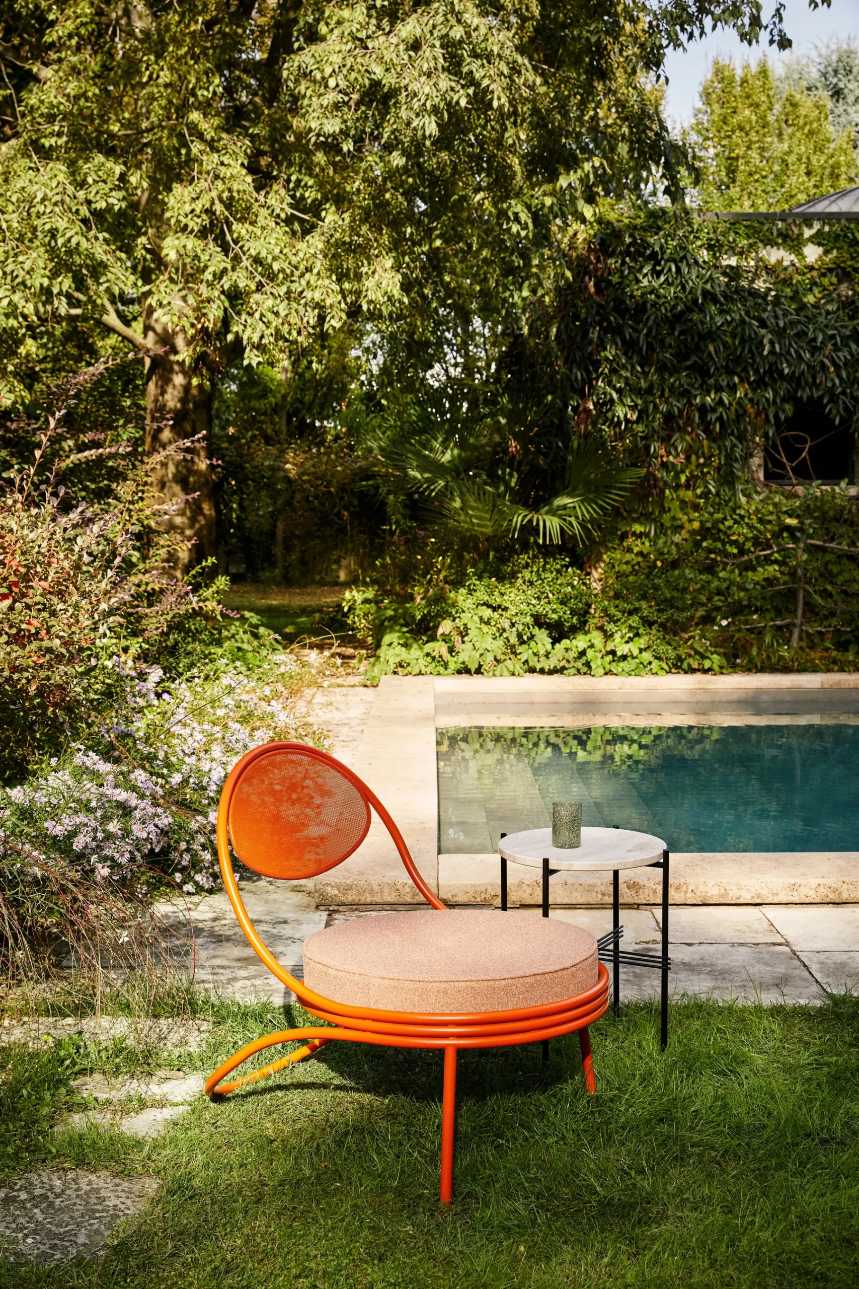 The smaller counterpart to the TS Coffee Table, maintaining the sophisticated and sculptural aesthetic defined by the slender legs and a contrasting solid tabletop. Its versatility extends to an outdoor version with a weather-resistant top and base.