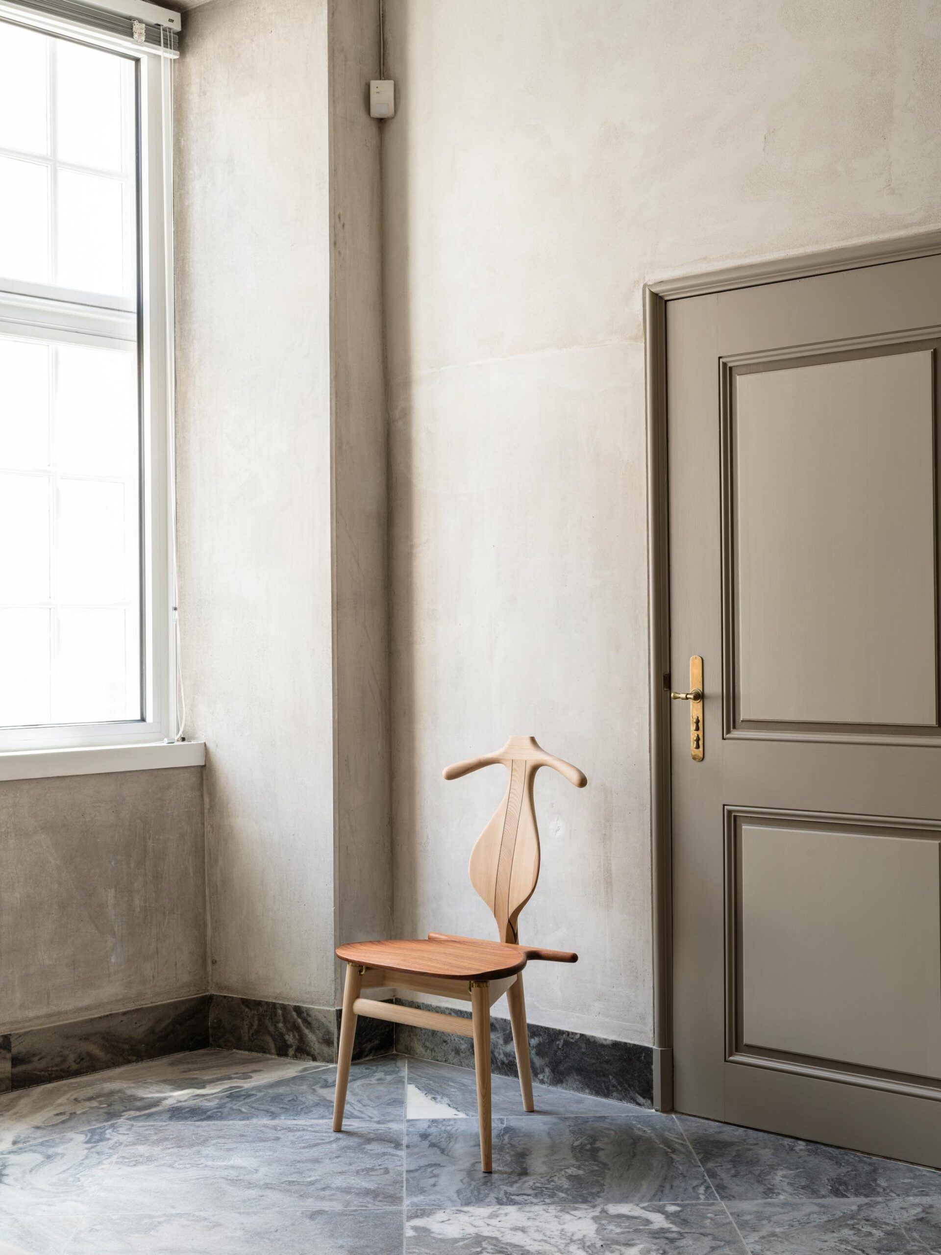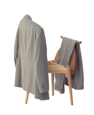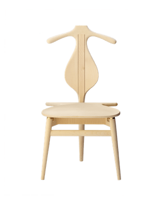 The Valet Chair is a sculptural fusion of furniture and function, reinterpreting the traditional valet stand as an elegantly crafted wooden chair. The sculpted back leg is shaped to serve both as a comfortable backrest and a hanger for jackets or coats, while the carefully contoured seat provides a relaxed sitting experience. The seat is hinged, allowing it to stand upright for placing clothes when not in use. Beneath the seat, a discreet storage compartment offers space for personal belongings. Balancing craftsmanship, practicality, and visual presence, the Valet Chair is both a functional object and a refined design statement.