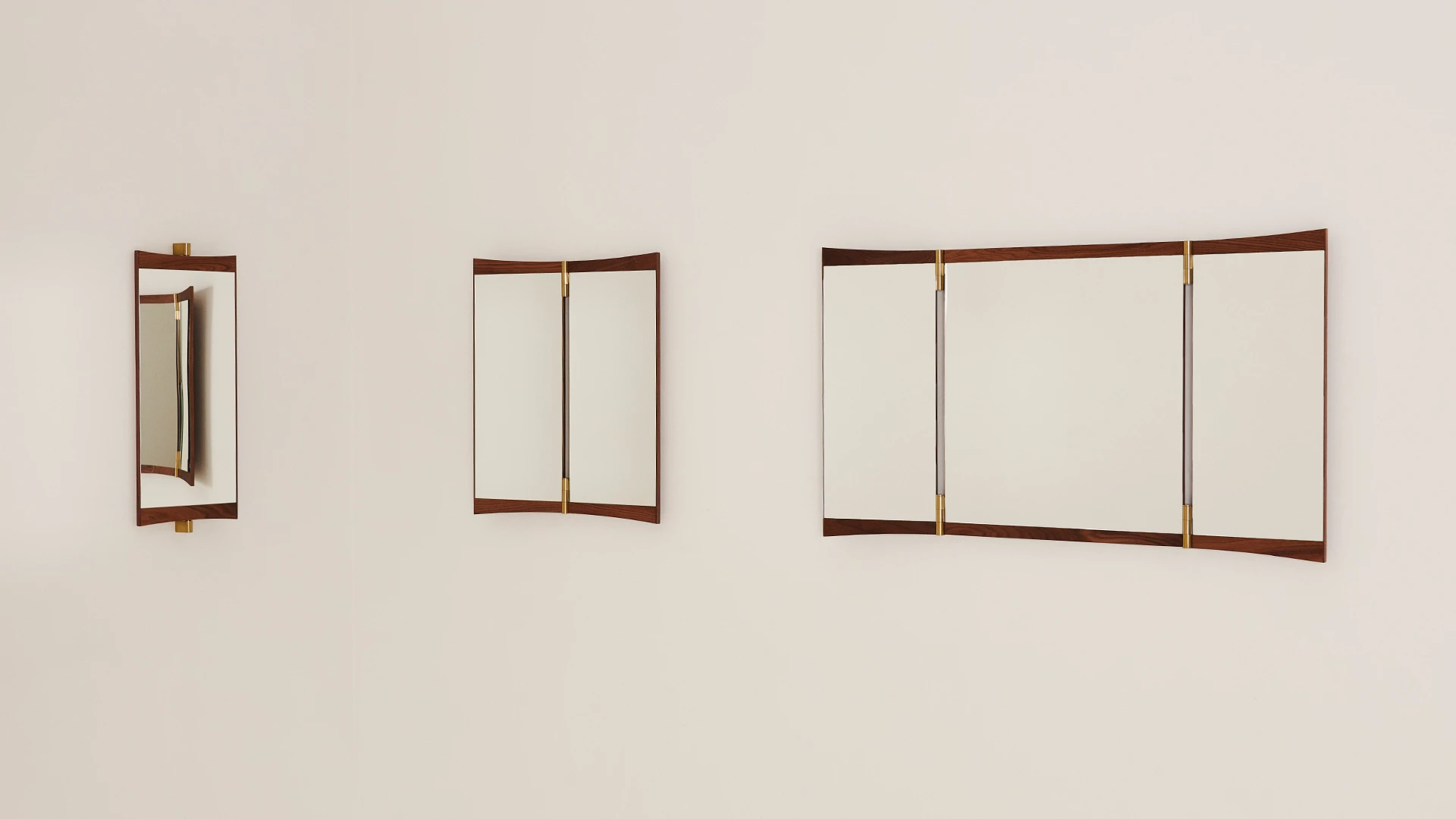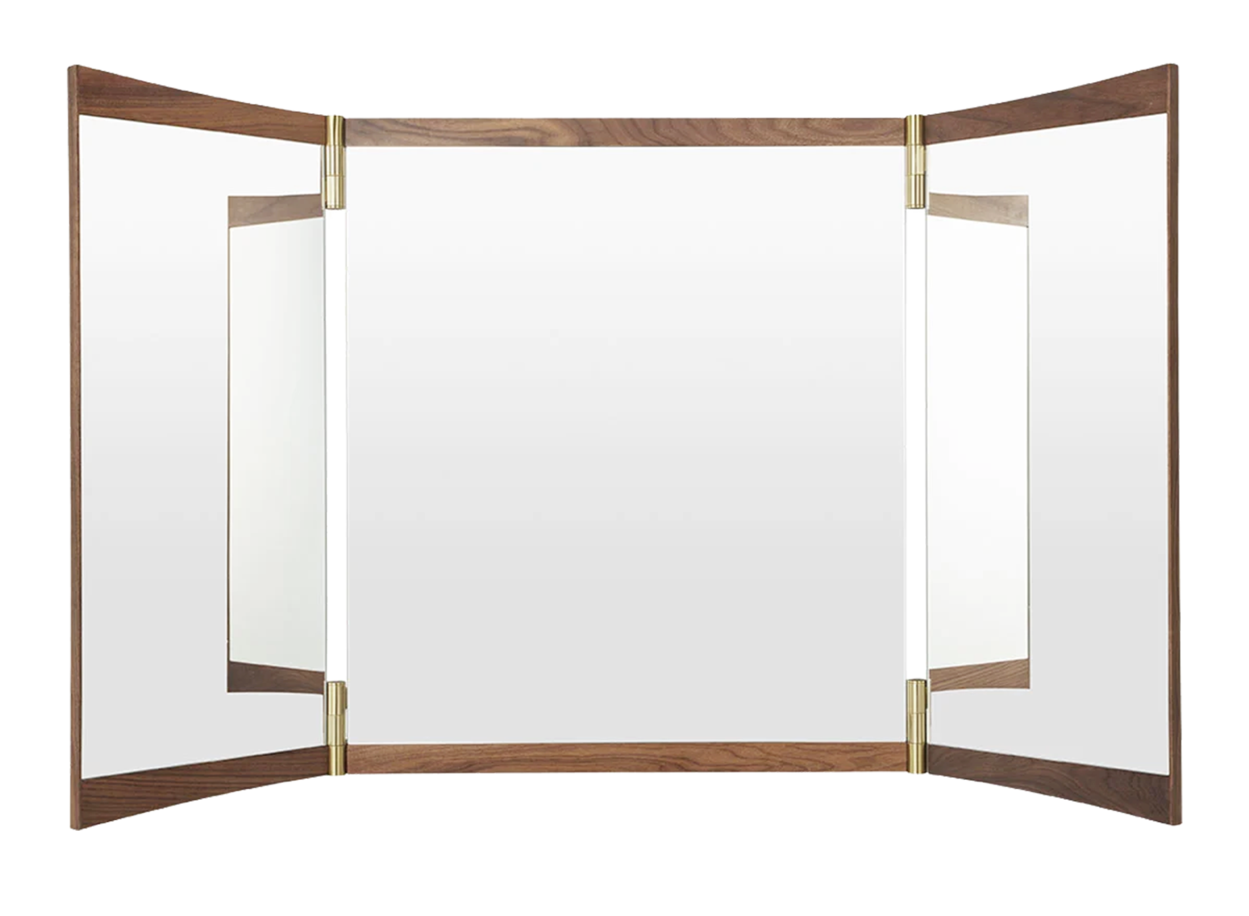 Designed by GamFratesi for GUBI, the Vanity Mirror Collection is a contemporary interpretation of the classic 18th-century vanity mirror. This wall-mounted series includes three versions with one, two, or three mirror panels, each defined by warm walnut veneer frames and elegant brass hinges. The adjustable hinges allow the mirror panels to pivot, subtly changing perspective and enhancing the play of light within the room. Vanity Mirror 1 offers a 15° rotation, while Vanity Mirror 2 and 3 feature 180° hinges, enabling the panels to fold flat and conceal the mirror when not in use. A refined balance of function, materiality, and timeless elegance.