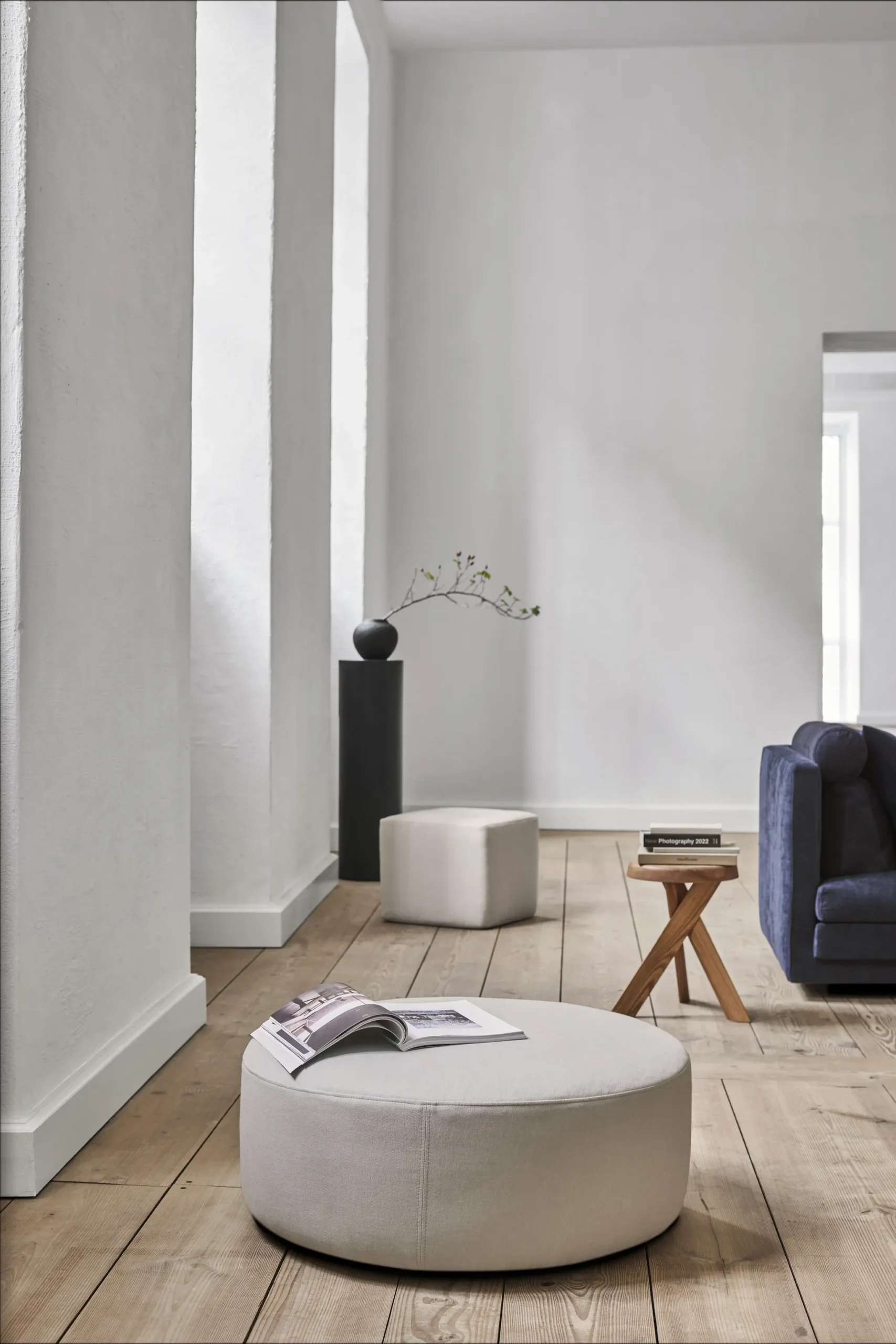 The Wheel Footstool is a contemporary round pouffe that works as a footrest, extra seat, or lounge piece, with discreet black lacquered legs that keep the form visually pure.