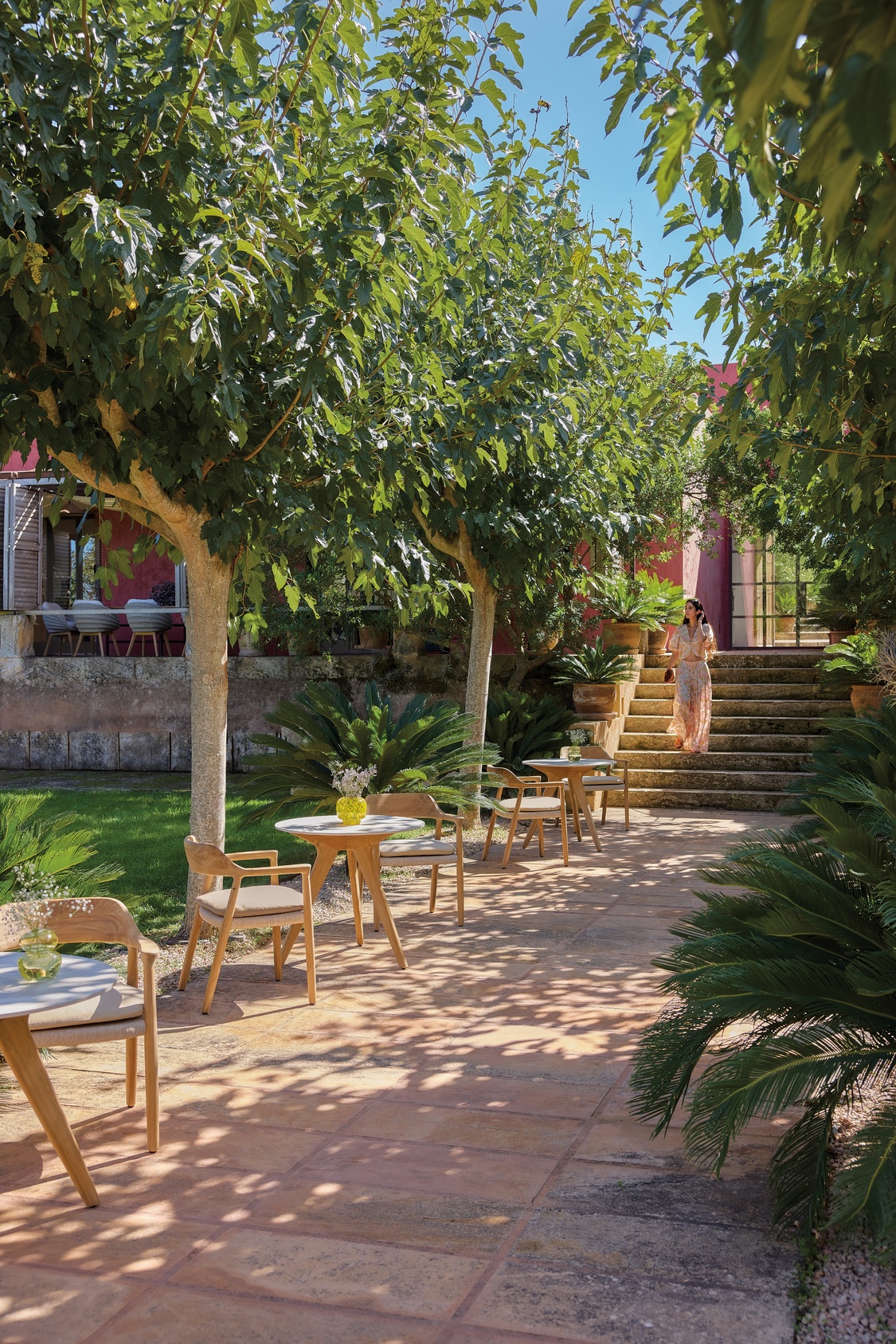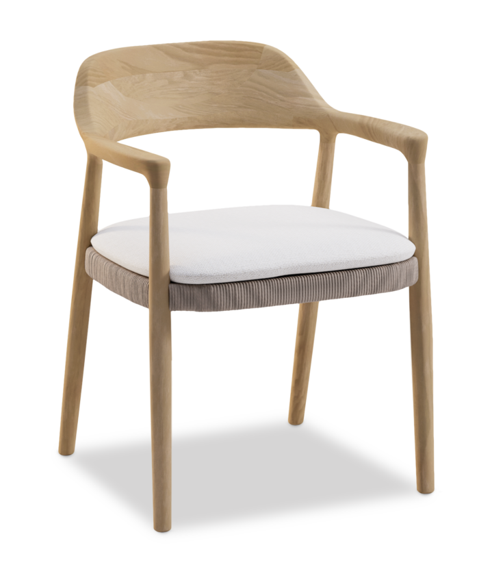 A plush seat cushion completes the design with gentle support and a clean, modern look that stays comfortable through long meals and relaxed evenings outdoors. Yiko pairs effortlessly with teak, ceramic or stone dining tables and suits terraces, poolside settings or garden dining areas with its calm, refined aesthetic. It is a timeless outdoor dining chair crafted with Manutti’s signature attention to comfort, quality and natural materials.